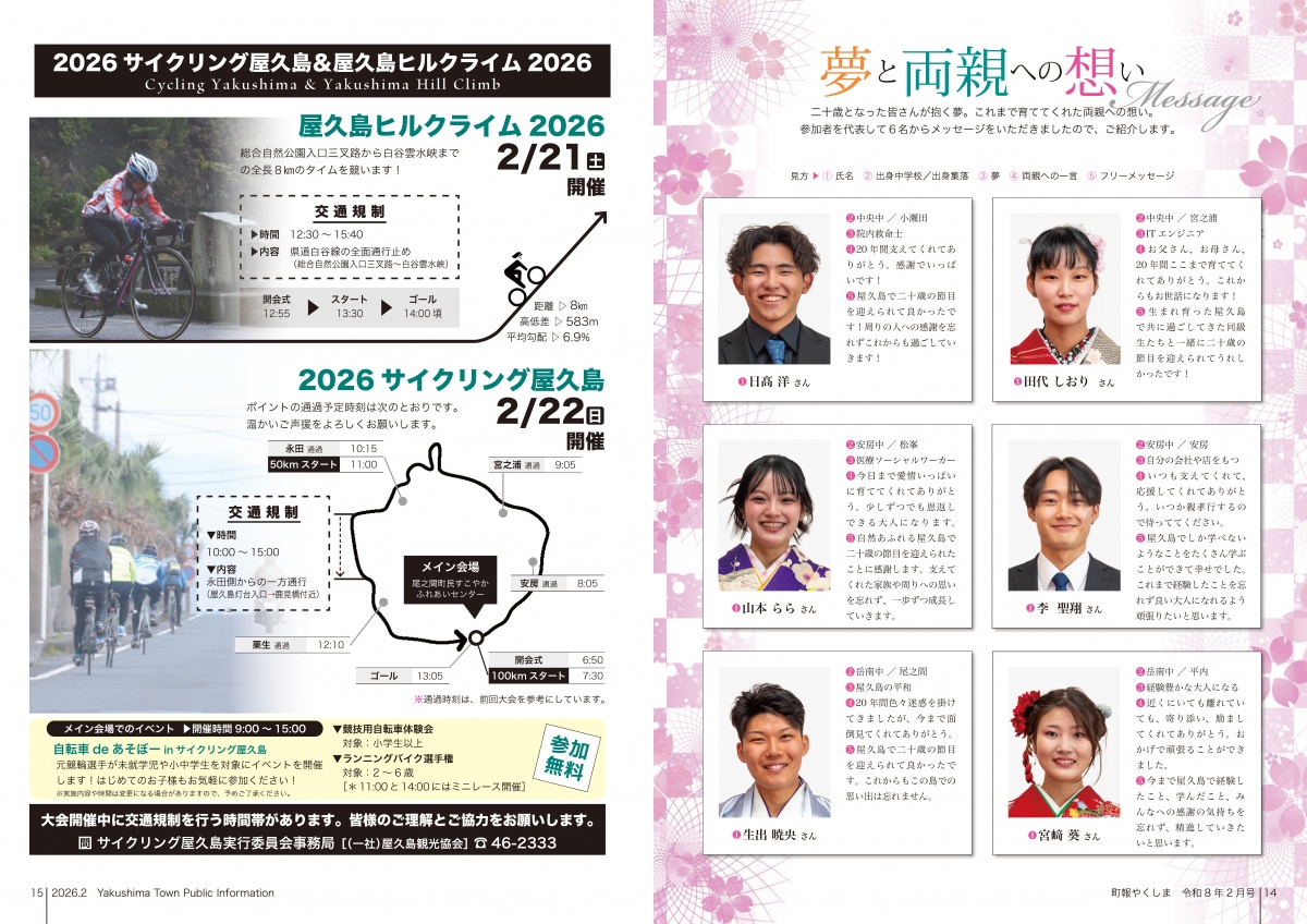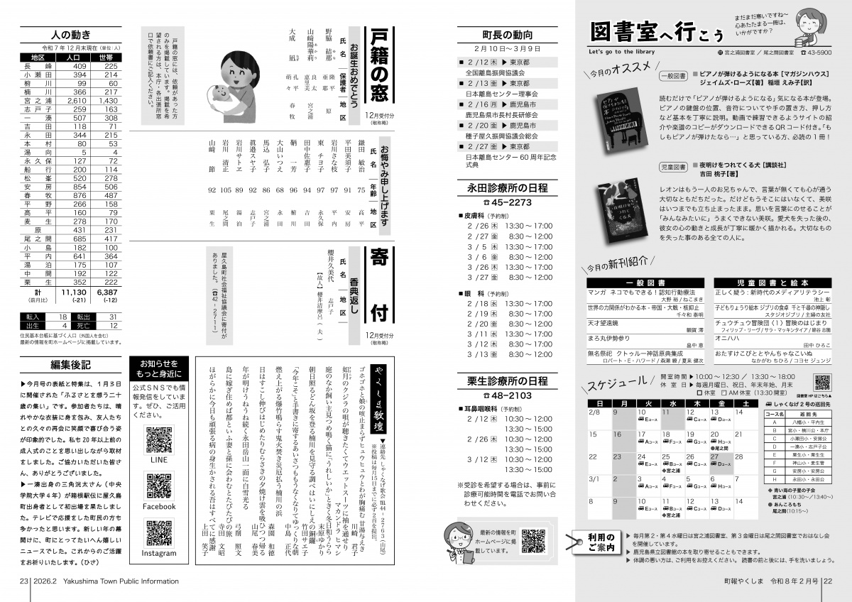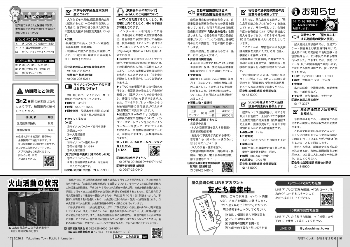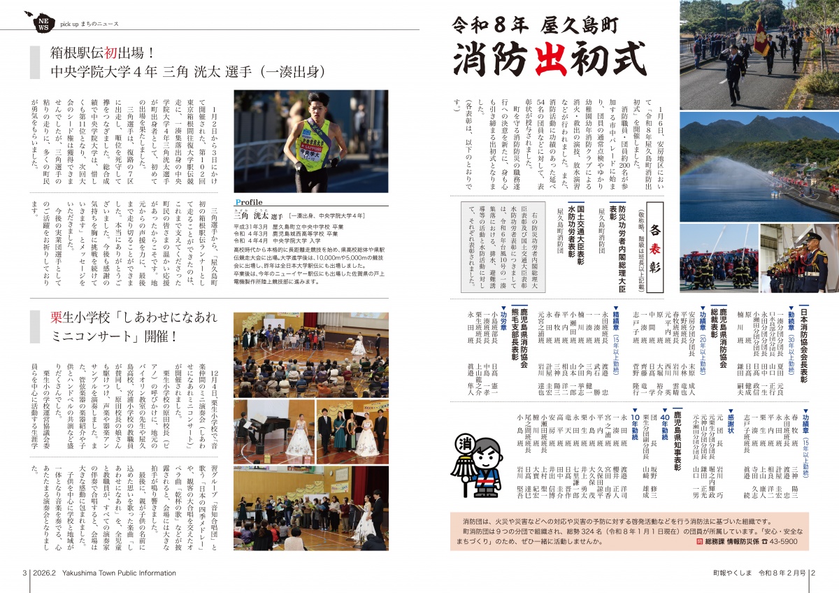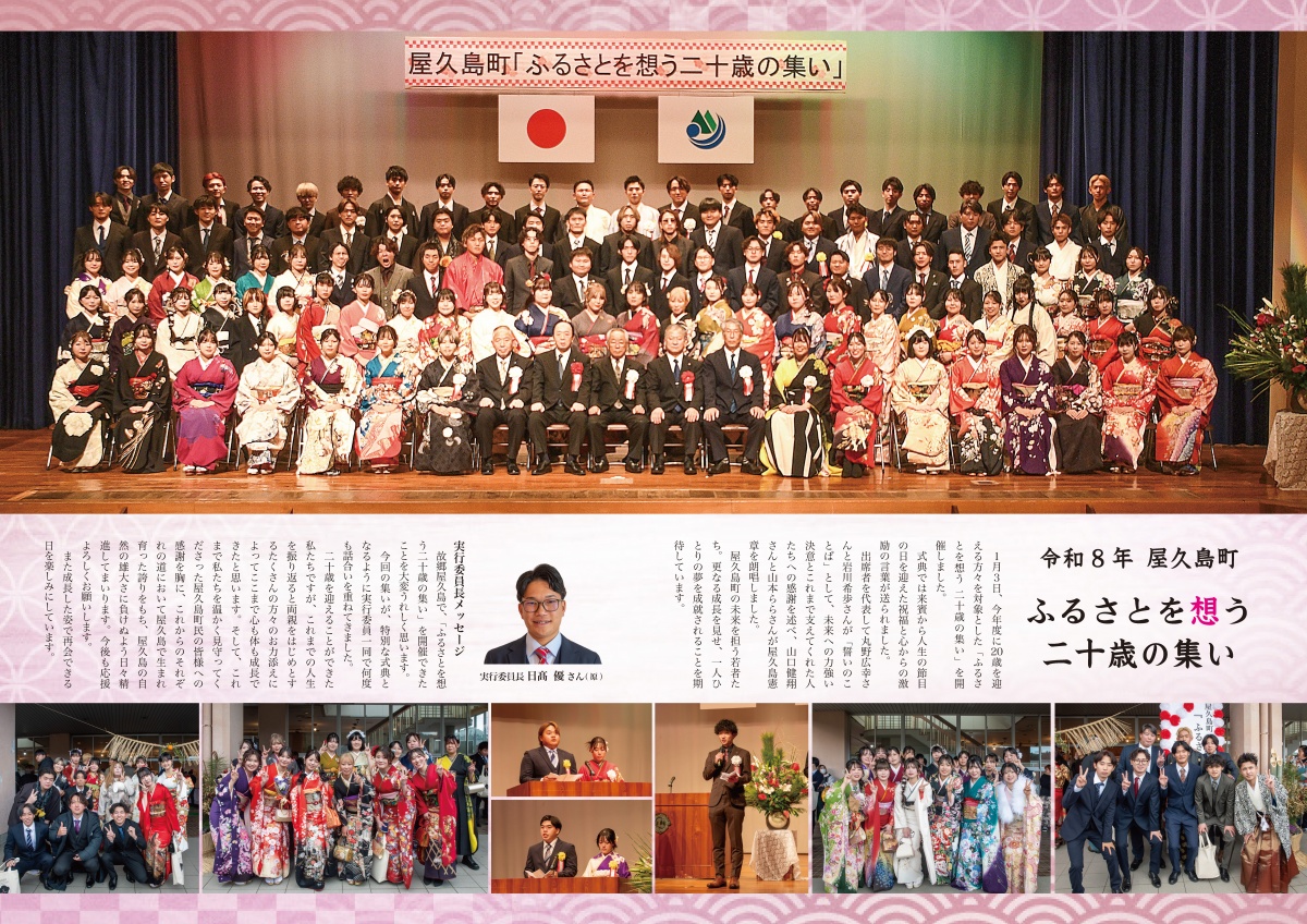 町報やくしま2月号を掲載しました 町報やくしま 令和8年2月号 町報のダウンロード 町報やくしま 令和8年2月号 全ページダウンロード(24ページ) 約6.5MB 町報やくしまが電子ブック形式で読めます。 ▼ マチイロ 掲載内容 内容 プレビュー 表紙 1月3日に開催した「ふるさとを想う二十歳の集い」の実行委員のみなさん。 2〜3ページ pickupまちのニュース 4〜5ページ pickupまちのニュース 6〜7ページ 令和8年度会計年度任用職員募集 8〜9ページ まちからのお知らせ 10〜11ページ まちからのお知らせ 12〜13ページ 令和8年ふるさとを想う二十歳の集い 14〜15ページ 夢と両親への想い/2026サイクリング屋久島 16〜17ページ くらしの情報 18〜19ページ 健幸だより/令和8年度集団検診の案内 地域おこし協力隊通信/緑の基金 20〜21ページ 教育委員会だより 歴民館通信/屋久杉自然館 22〜23ページ 図書室へ行こう/町長の主な動向/診療所日程 戸籍の窓/人の動き/やくしま歌壇/編集後記 24ページ 町民カレンダー/魚の日