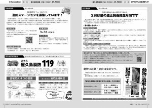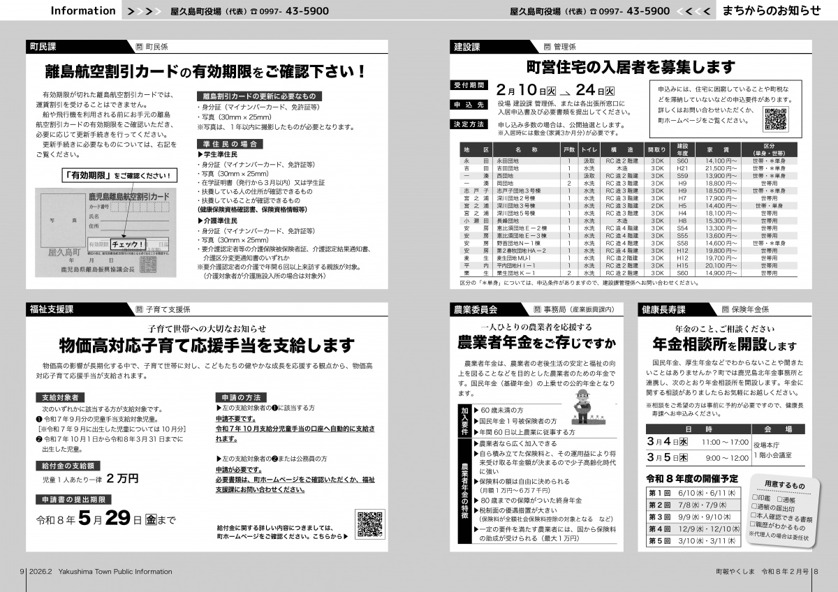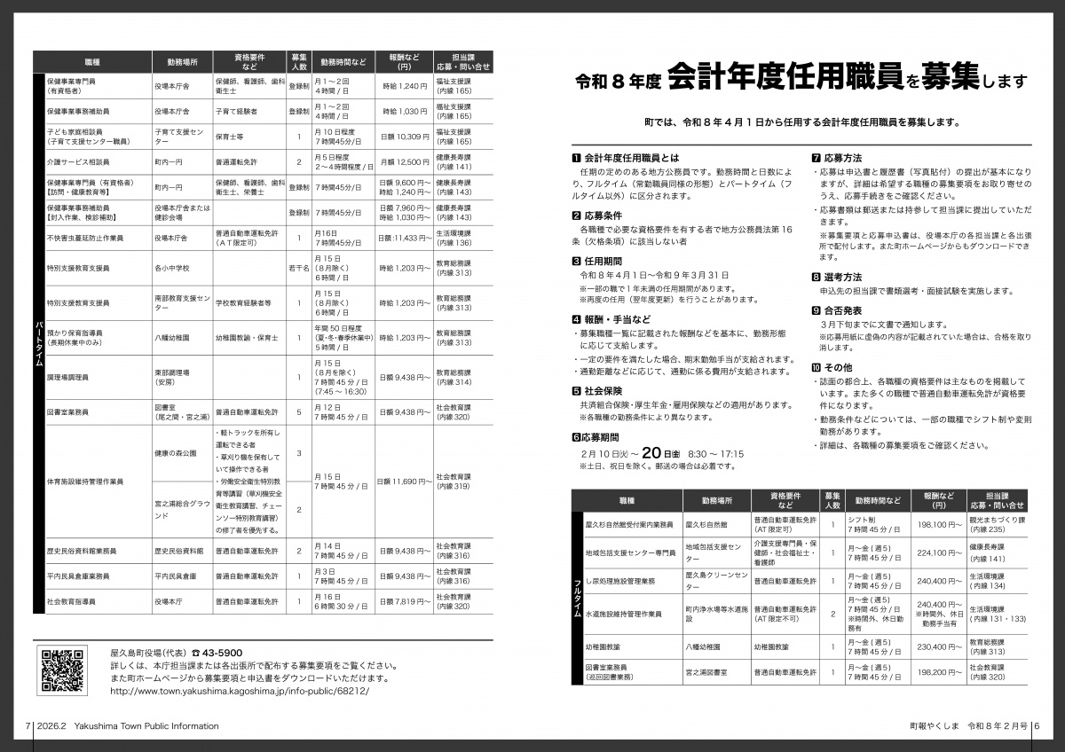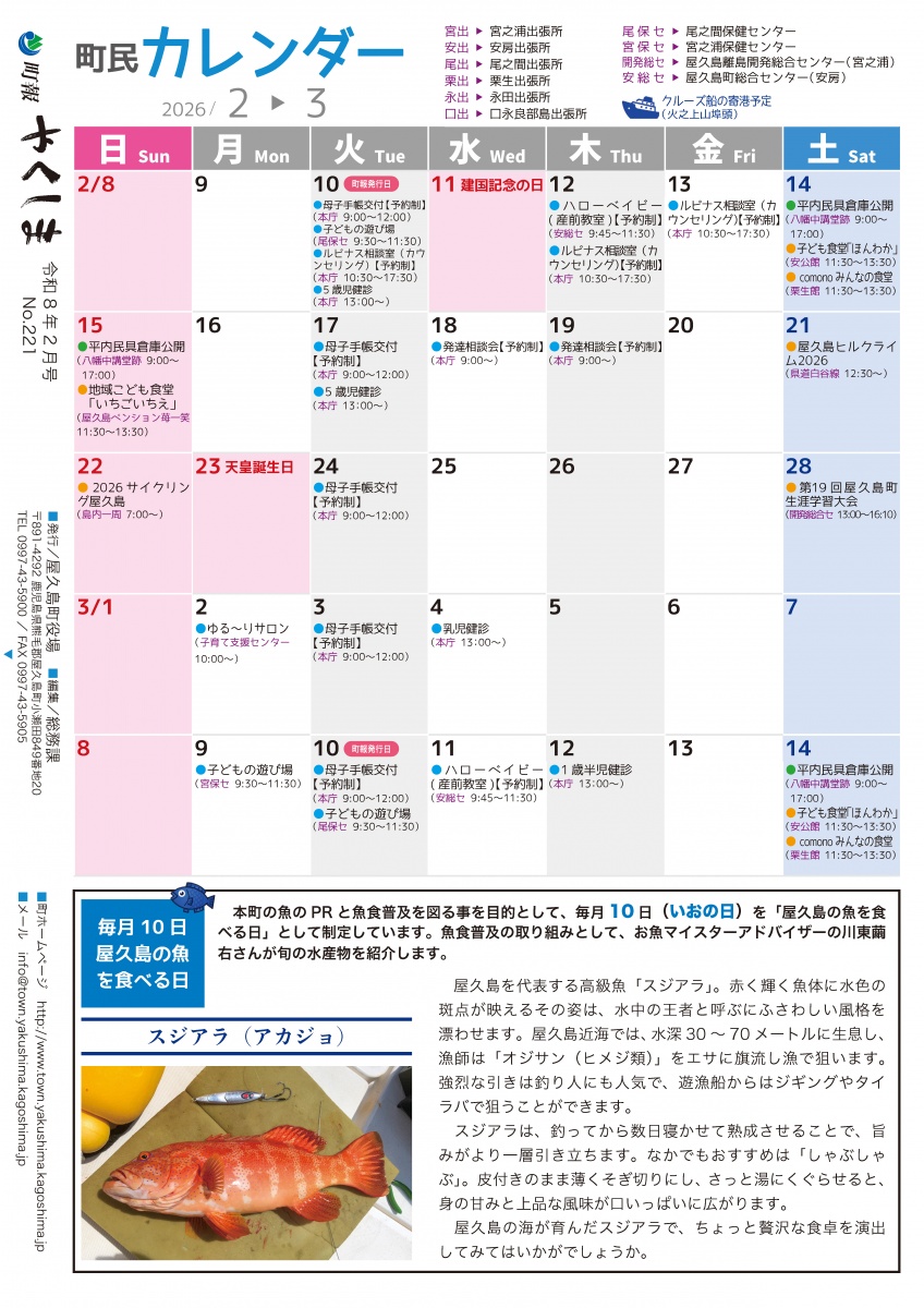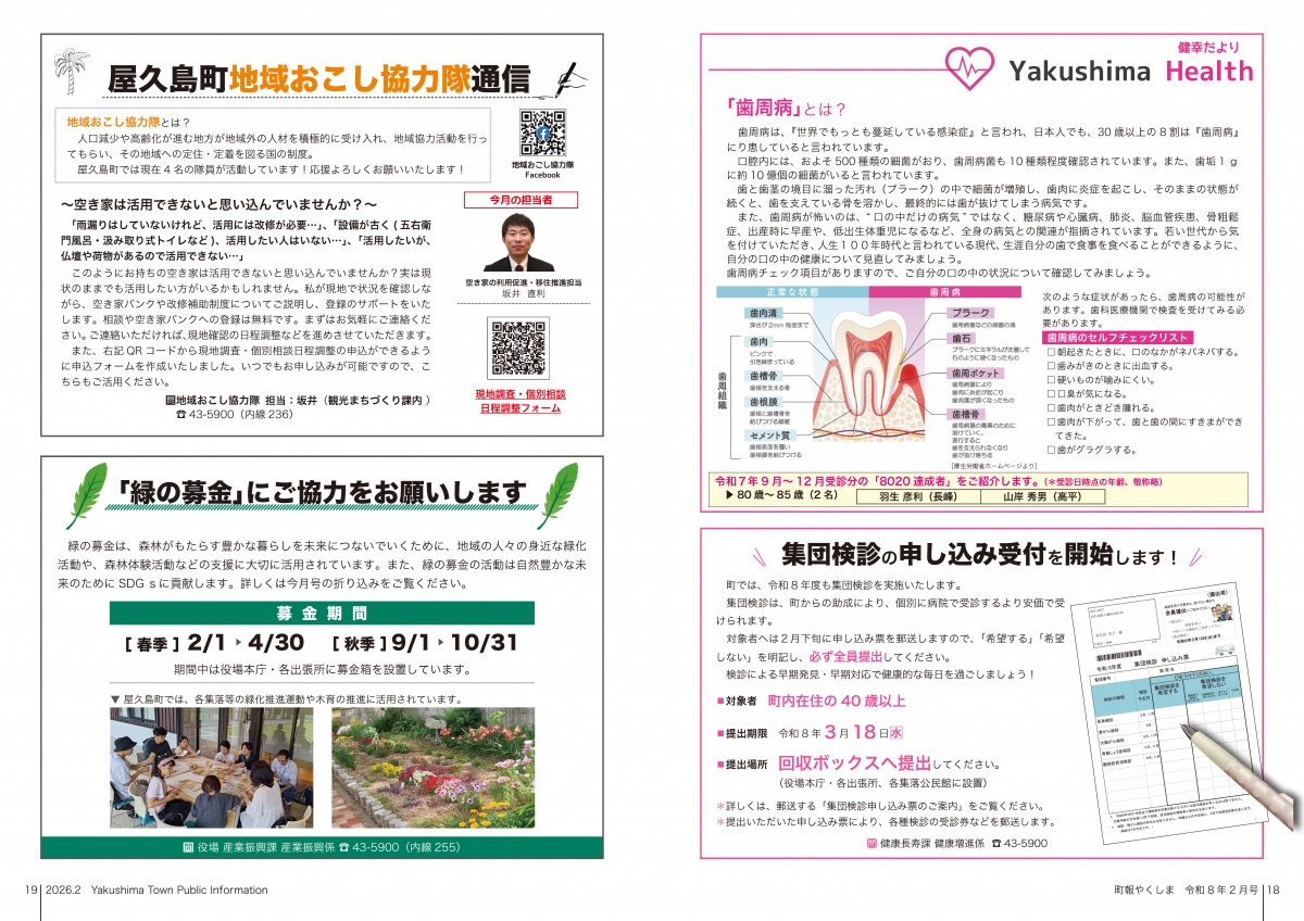 町報やくしま2月号を掲載しました 町報やくしま 令和8年2月号 町報のダウンロード 町報やくしま 令和8年2月号 全ページダウンロード(24ページ) 約6.5MB 町報やくしまが電子ブック形式で読めます。 ▼ マチイロ 掲載内容 内容 プレビュー 表紙 1月3日に開催した「ふるさとを想う二十歳の集い」の実行委員のみなさん。 2〜3ページ pickupまちのニュース 4〜5ページ pickupまちのニュース 6〜7ページ 令和8年度会計年度任用職員募集 8〜9ページ まちからのお知らせ 10〜11ページ まちからのお知らせ 12〜13ページ 令和8年ふるさとを想う二十歳の集い 14〜15ページ 夢と両親への想い/2026サイクリング屋久島 16〜17ページ くらしの情報 18〜19ページ 健幸だより/令和8年度集団検診の案内 地域おこし協力隊通信/緑の基金 20〜21ページ 教育委員会だより 歴民館通信/屋久杉自然館 22〜23ページ 図書室へ行こう/町長の主な動向/診療所日程 戸籍の窓/人の動き/やくしま歌壇/編集後記 24ページ 町民カレンダー/魚の日