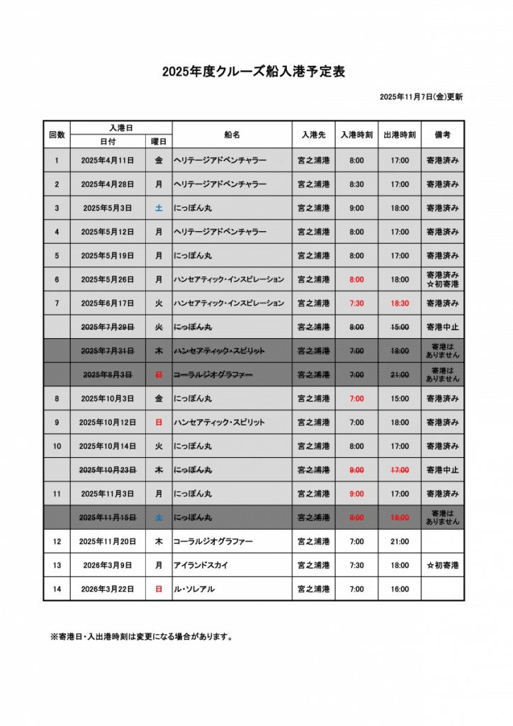 2025年度(令和7年度)のクルーズ船寄港スケジュールを以下のとおりお知らせします。