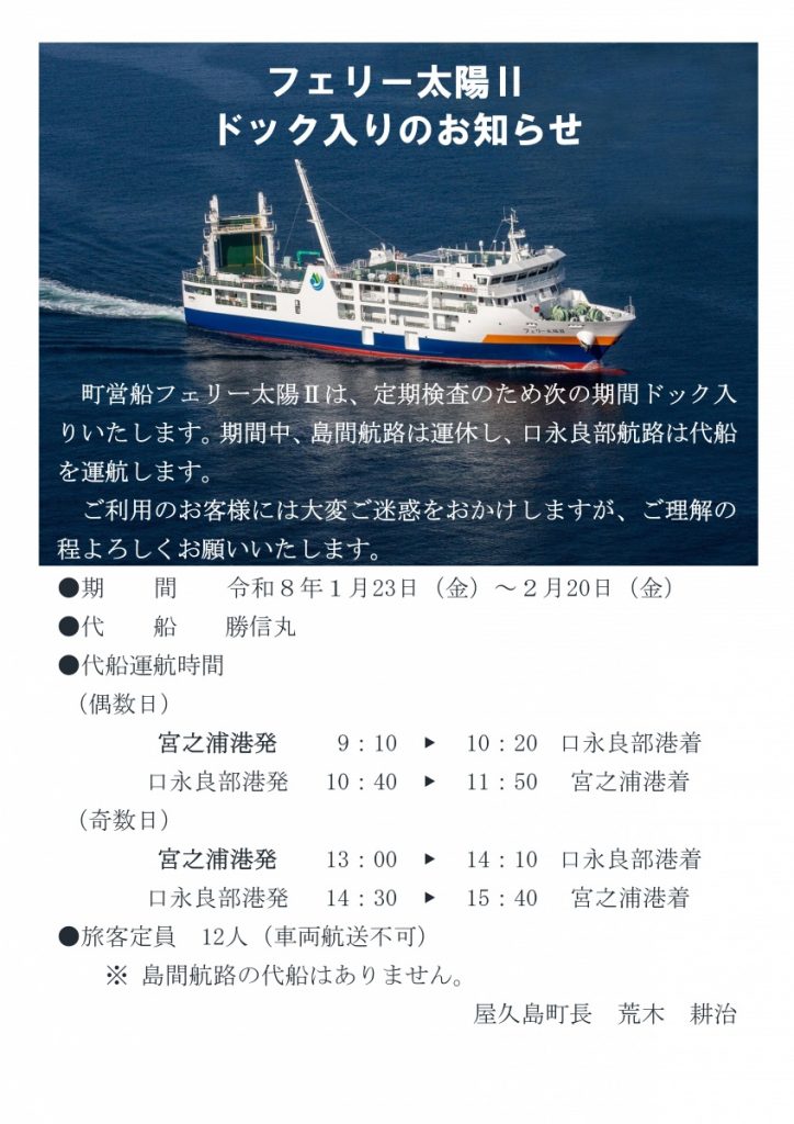 町営船フェリー太陽Ⅱは、定期検査のため下記の期間ドック入りいたします。期間中、島間航路は運休し、口永良部航路は代船により運航します。