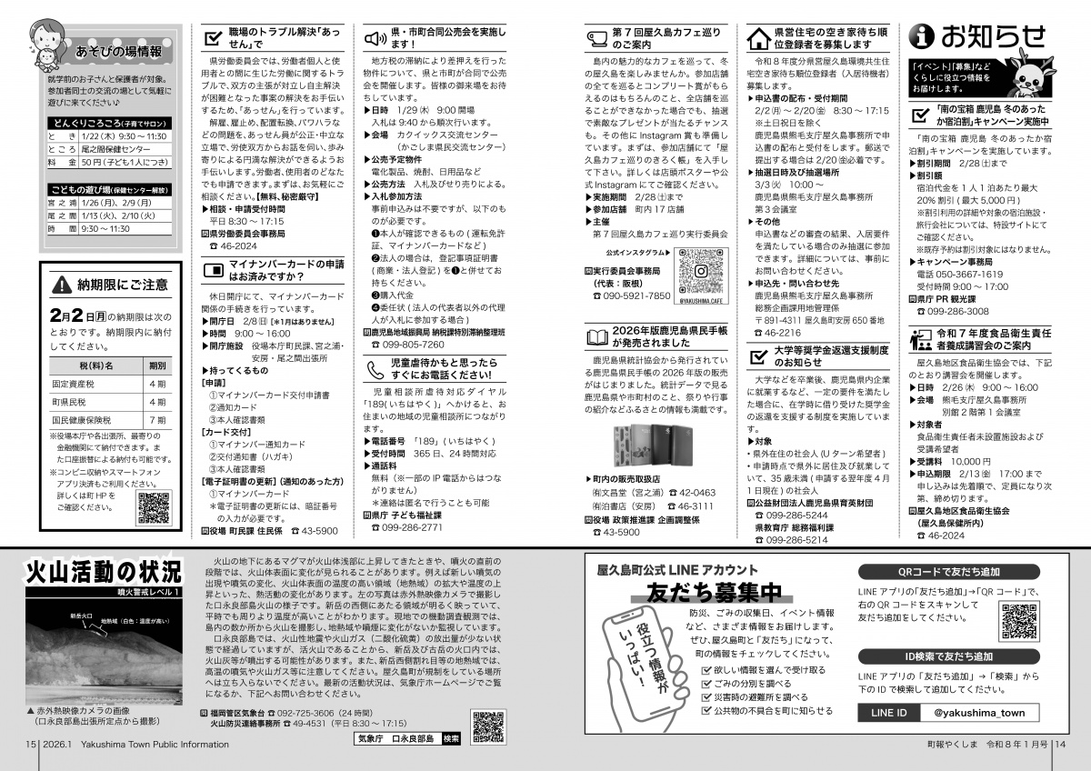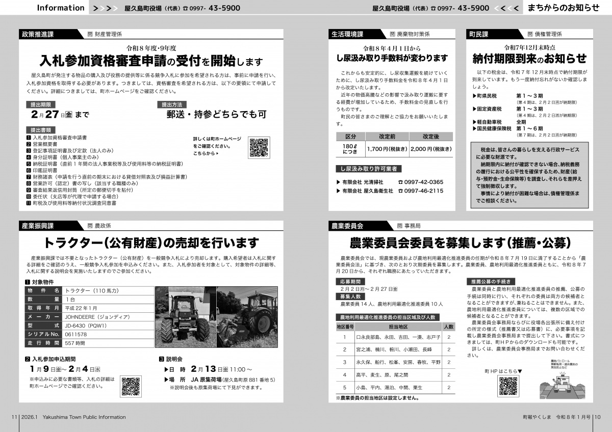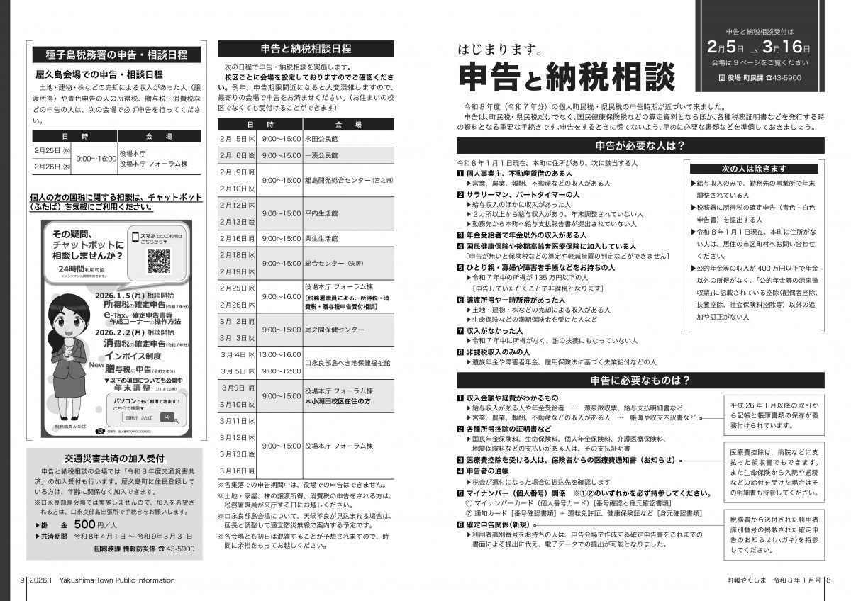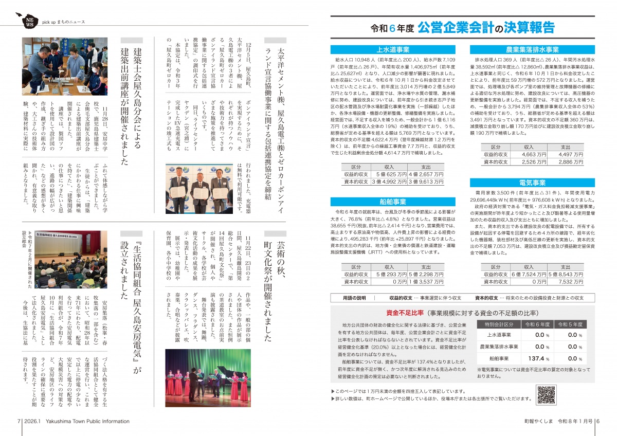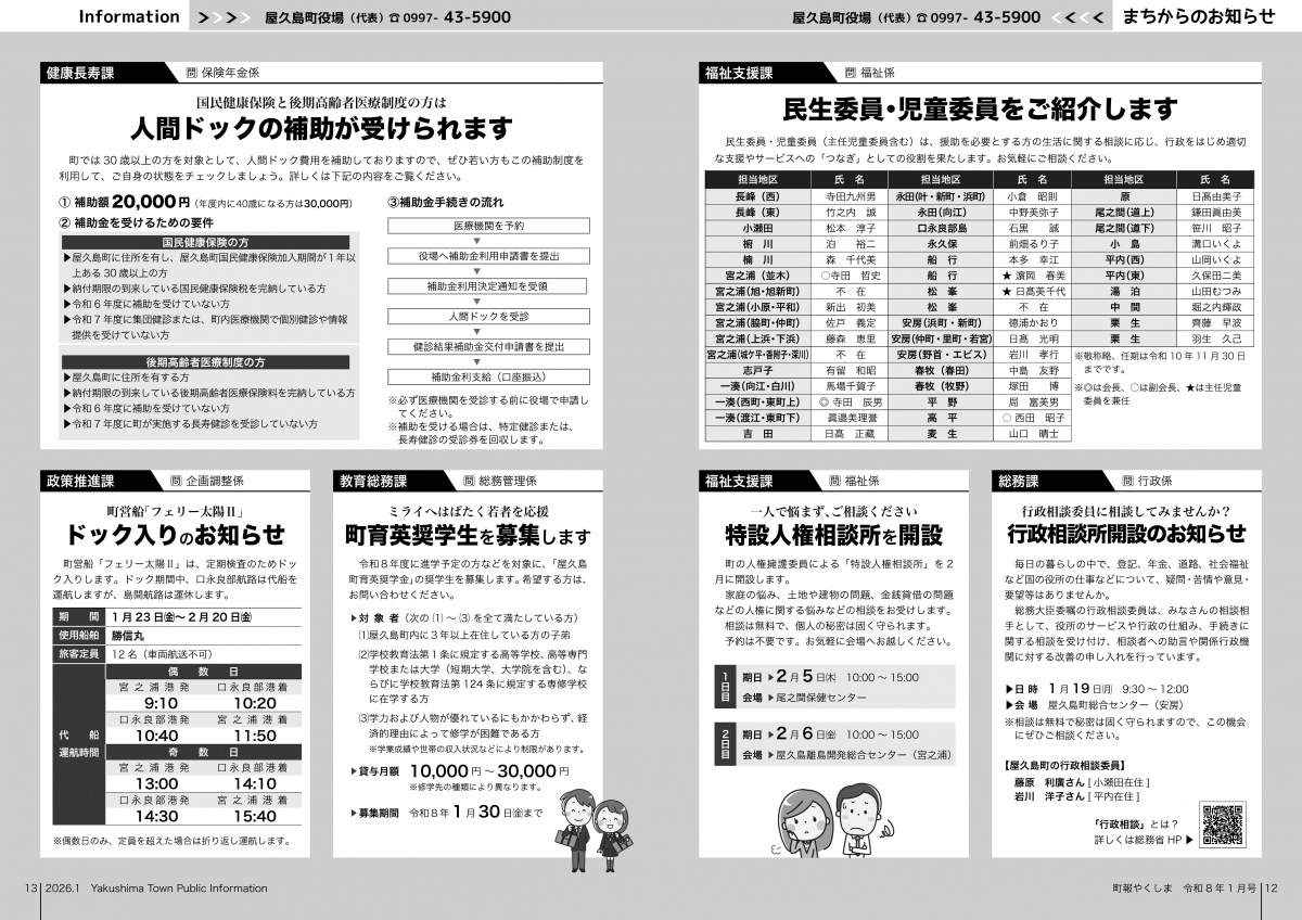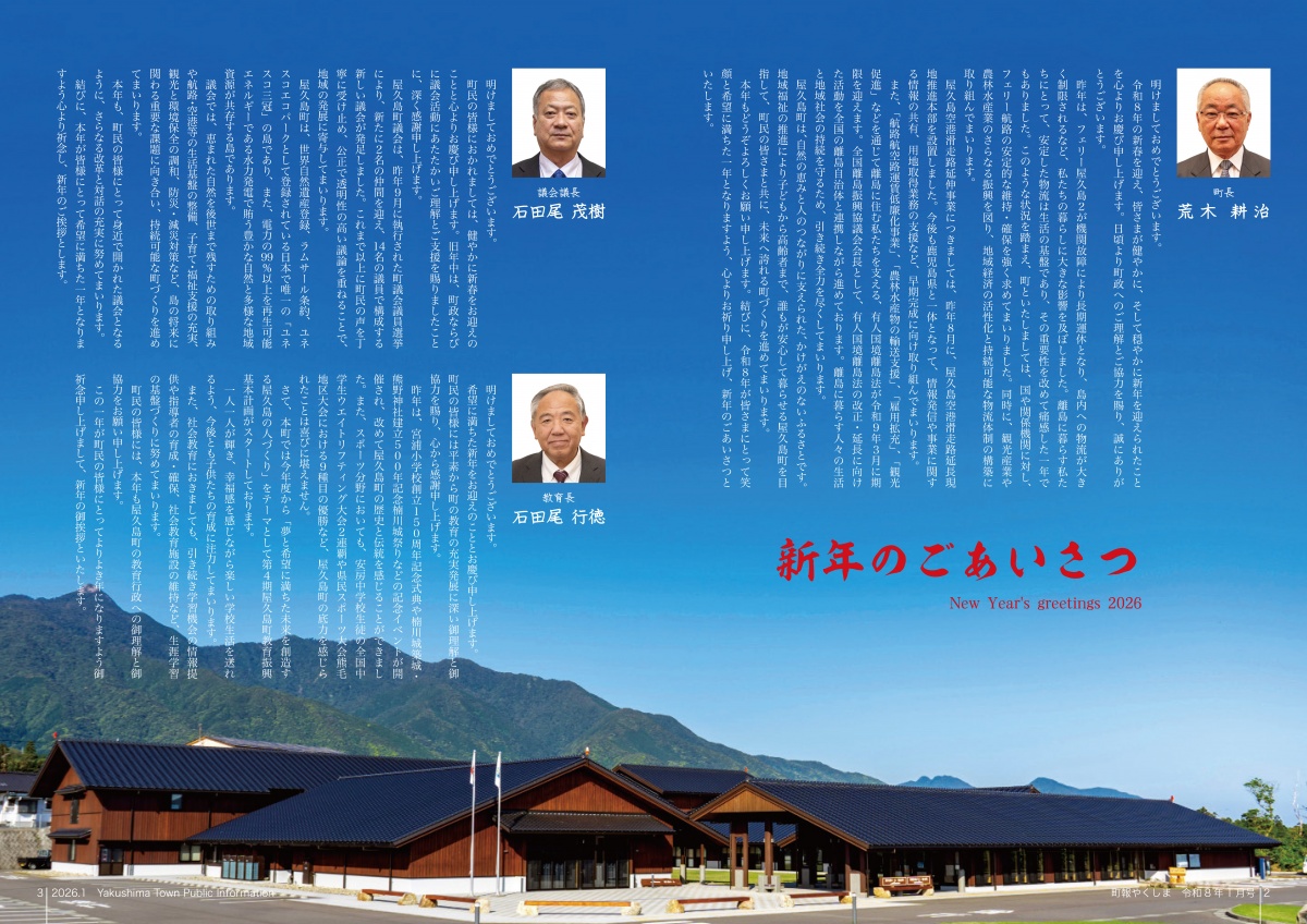 町報やくしま1月号を掲載しました 町報やくしま 令和8年1月号 町報のダウンロード 町報やくしま 令和8年1月号 全ページダウンロード(22ページ) 約4.2MB 町報やくしまが電子ブック形式で読めます。 ▼ マチイロ 掲載内容 内容 プレビュー 表紙 田代海岸から望む日の出 2〜3ページ 新年のごあいさつ 4〜5ページ 令和6年度決算報告(一般会計・特別会計) 6〜7ページ ・令和6年度決算報告(公営企業会計) ・pickupまちのニュース 8〜9ページ 申告と納税相談 10〜11ページ まちからのお知らせ 12〜13ページ まちからのお知らせ 14〜15ページ くらしの情報 16〜17ページ サイクリング屋久島/むし歯ぜろ 無料法律・登記相談所開設/地域おこし協力隊 18〜19ページ 教育委員会だより 歴民館通信/屋久杉自然館 20〜21ページ 図書室へ行こう/町長の主な動向/診療所日程 戸籍の窓/人の動き/やくしま歌壇/編集後記 22ページ 町民カレンダー/食改さんのレシピ