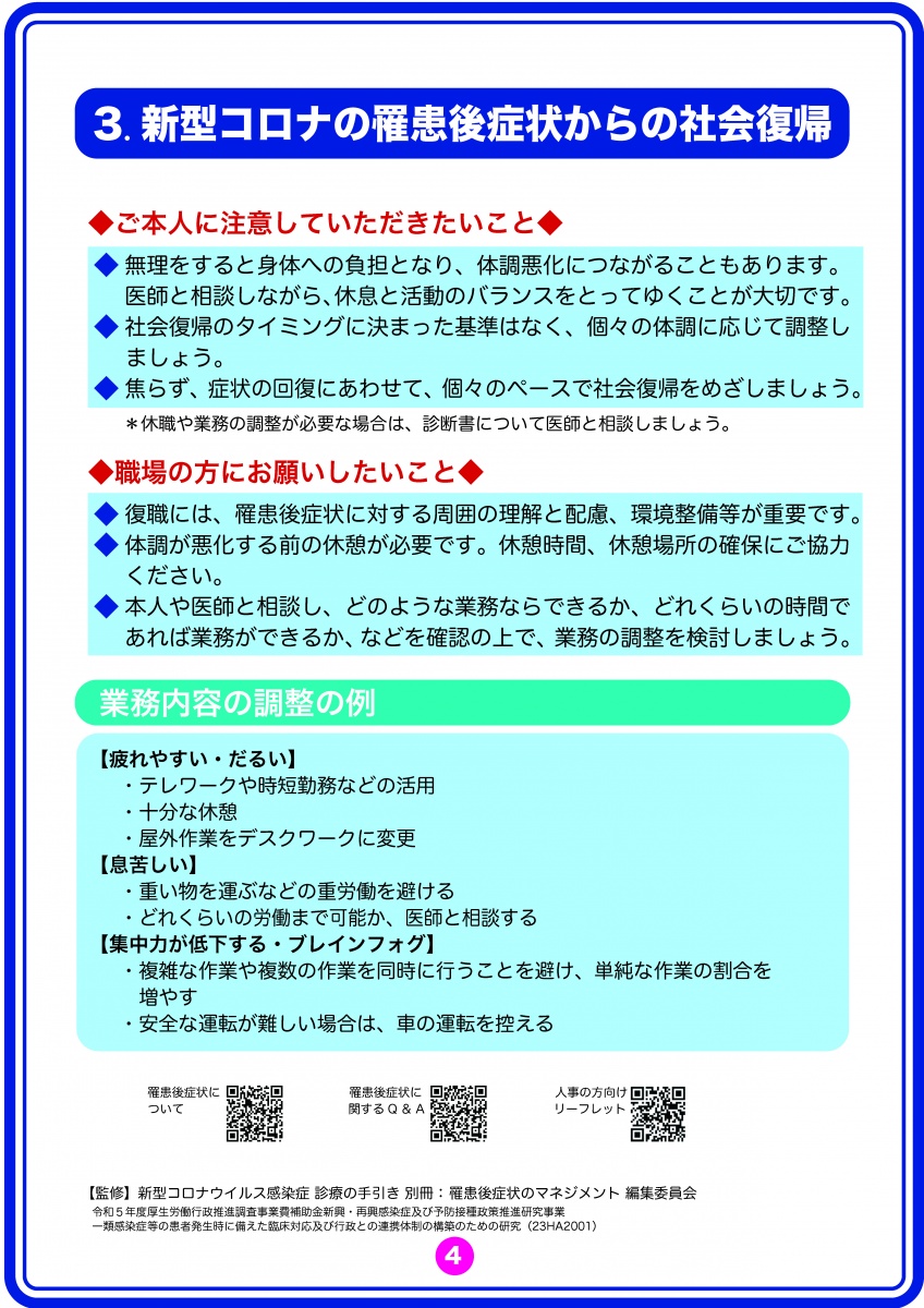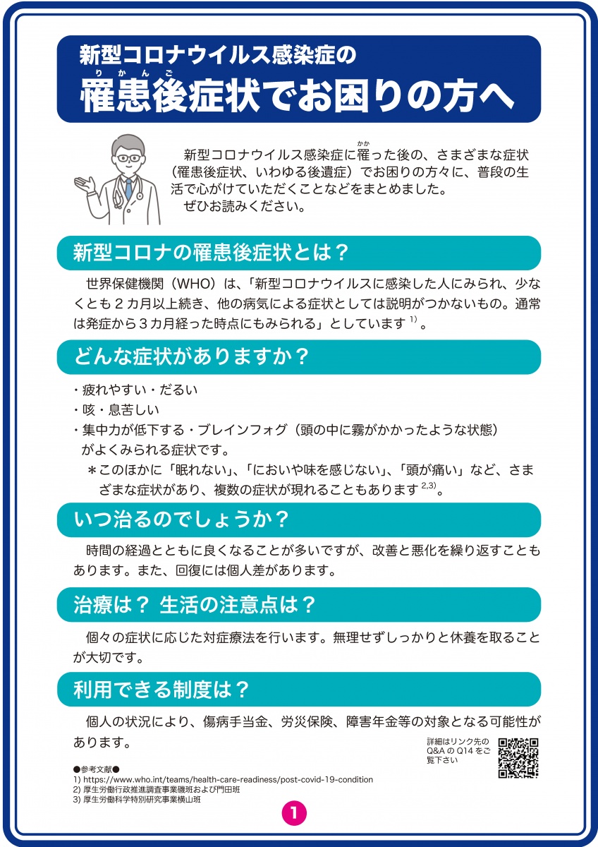 「どのような症状がありますか?」「罹患後症状は治りますか?」などの疑問については、厚生労働省ホームページの新型コロナウイルス感染症の罹患後症状(いわゆる後遺症)に関するQ&A(外部リンク)からご確認ください。